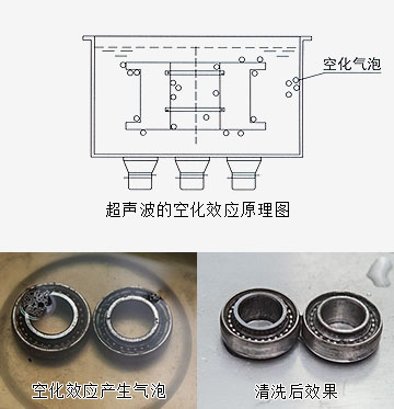 由超聲波發生器所發生的高頻振蕩訊號,通過換能器轉換成高頻機械振動而傳播到介質中,超聲波在清洗液中疏密相問地向前輻射,當聲波的壓強達到一定的大氣壓時,產生數以萬計的微小氣泡,這些氣泡在超聲波縱向傳播的負壓區形成、生長,而在正壓區迅速閉合。這種現象稱為超聲"空化效應",產生氣泡時所需的壓力稱為超聲"空化閥值"。